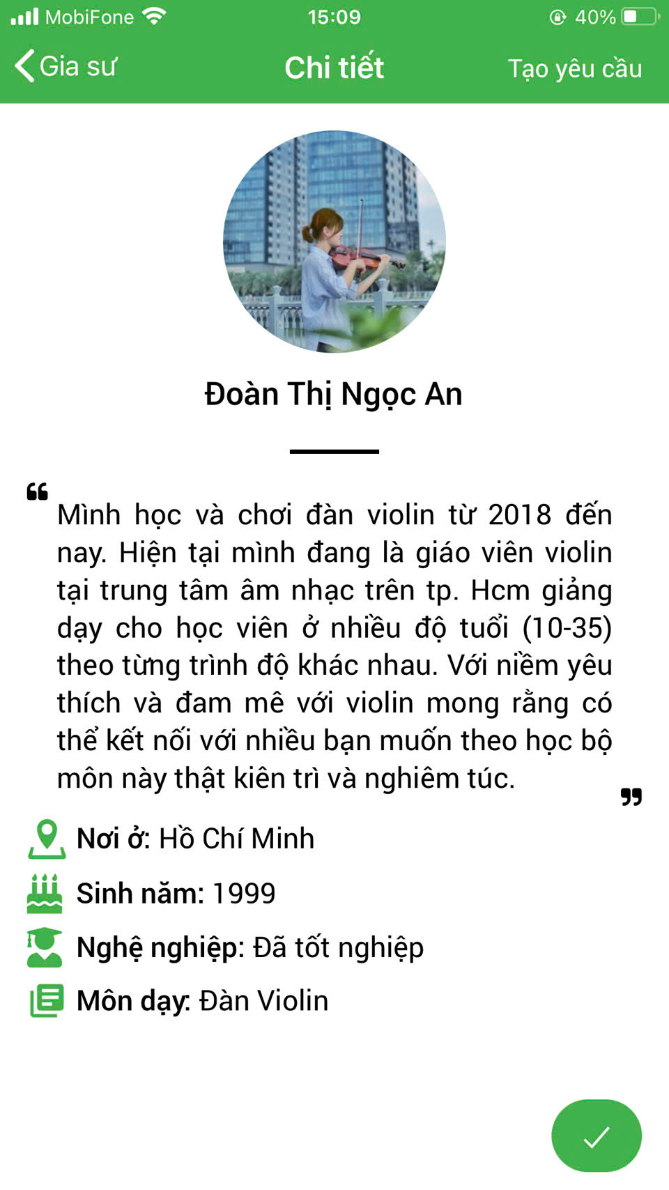 Bằng những thao tác đơn giản và thuận tiện, các học viên sẽ tìm cho mình gia sư phù hợp bằng nhiều tiêu chí khác nhau, dễ dàng tra cứu thông tin gia sư và nội dung lớp học; đồng thời có thể gửi yêu cầu học thử 02 buổi với gia sư mà mình chọn, nếu không phù hợp thì học viên sẽ được tư vấn kỹ hơn và tiếp tục chọn gia sư đến khi nào phù hợp mới thôi.